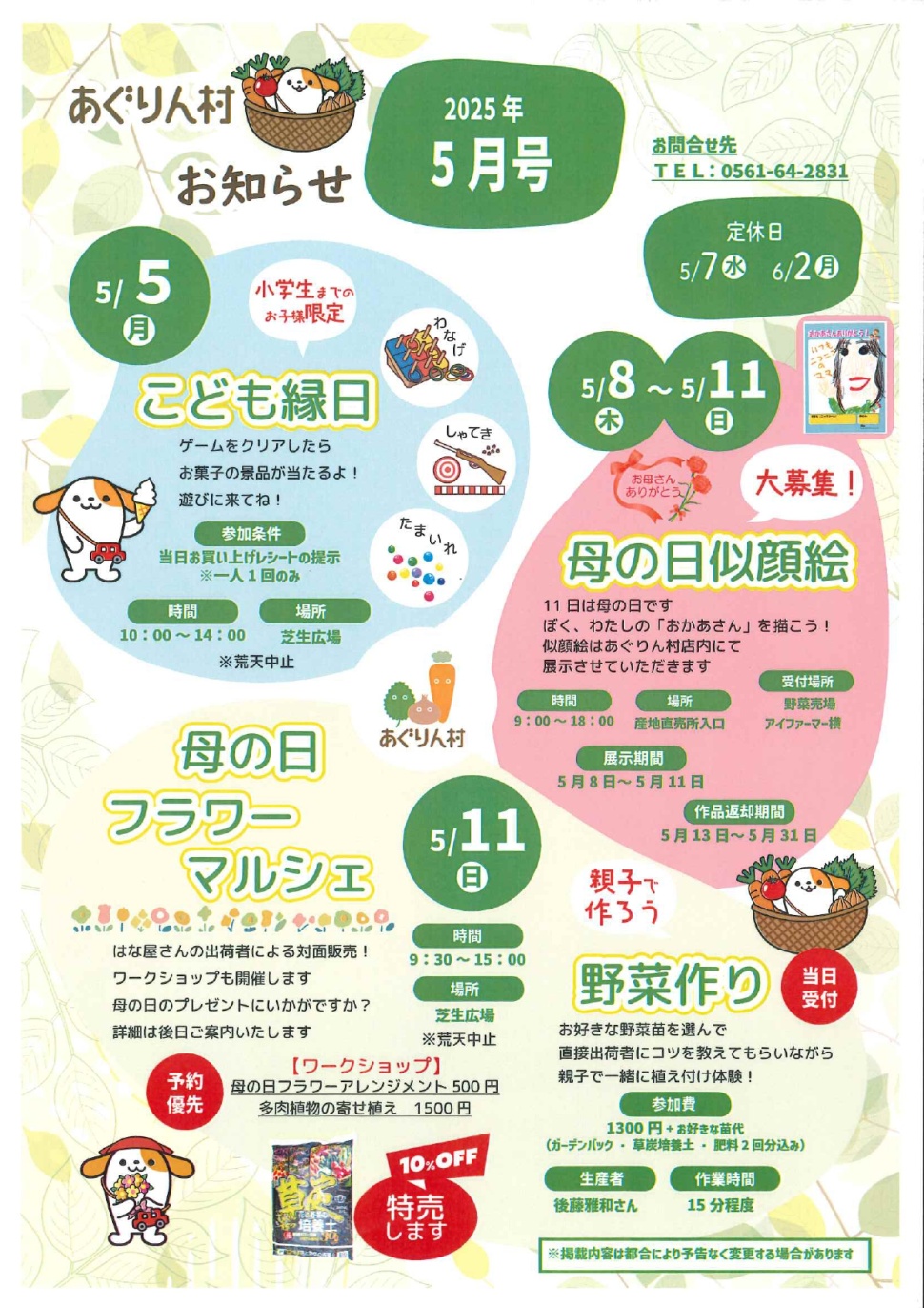 あぐりん村5月イベント情報 あぐりん村5月のイベントを掲載しました。 5月5日こどもの日はあぐりん村でこども縁日を開催します。 また、母の日の似顔絵コーナーやフラワーマルシェなどイベントを開催します。 是非ともご来店下さい。