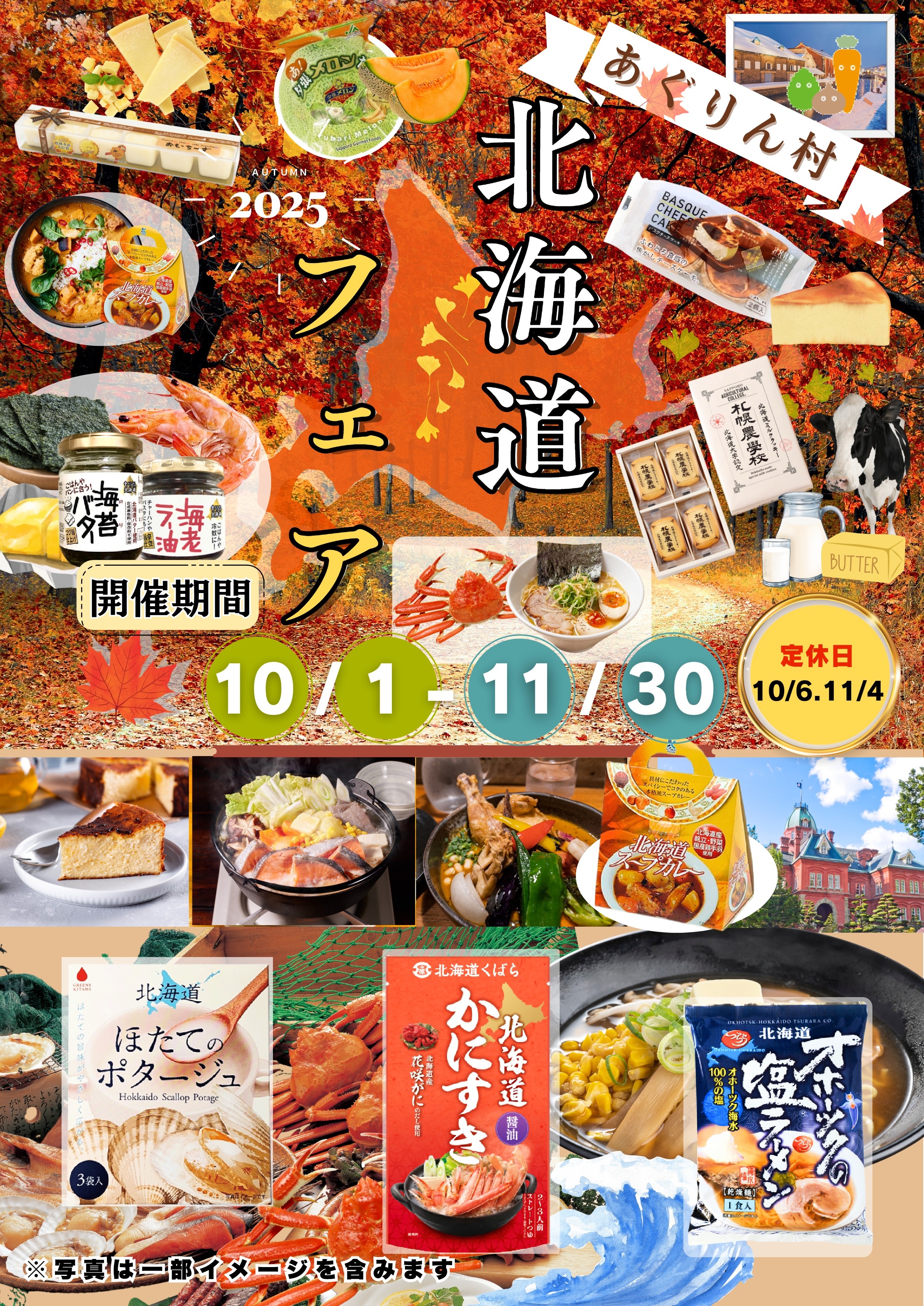 北海道フェア開始(~11/30まで) 期間限定で北海道フェアを開催! お菓子やおつまみはもちろん、これからの季節にぴったりな「鍋の素」も揃っています。 あぐりん村で北海道ならではの味覚をぜひ味わってみてください。 【開催期間】10月1日(水)~11月30日(日) ※10月6日(月)、11月4日(火)は定休日 【開催場所】農産物直売所