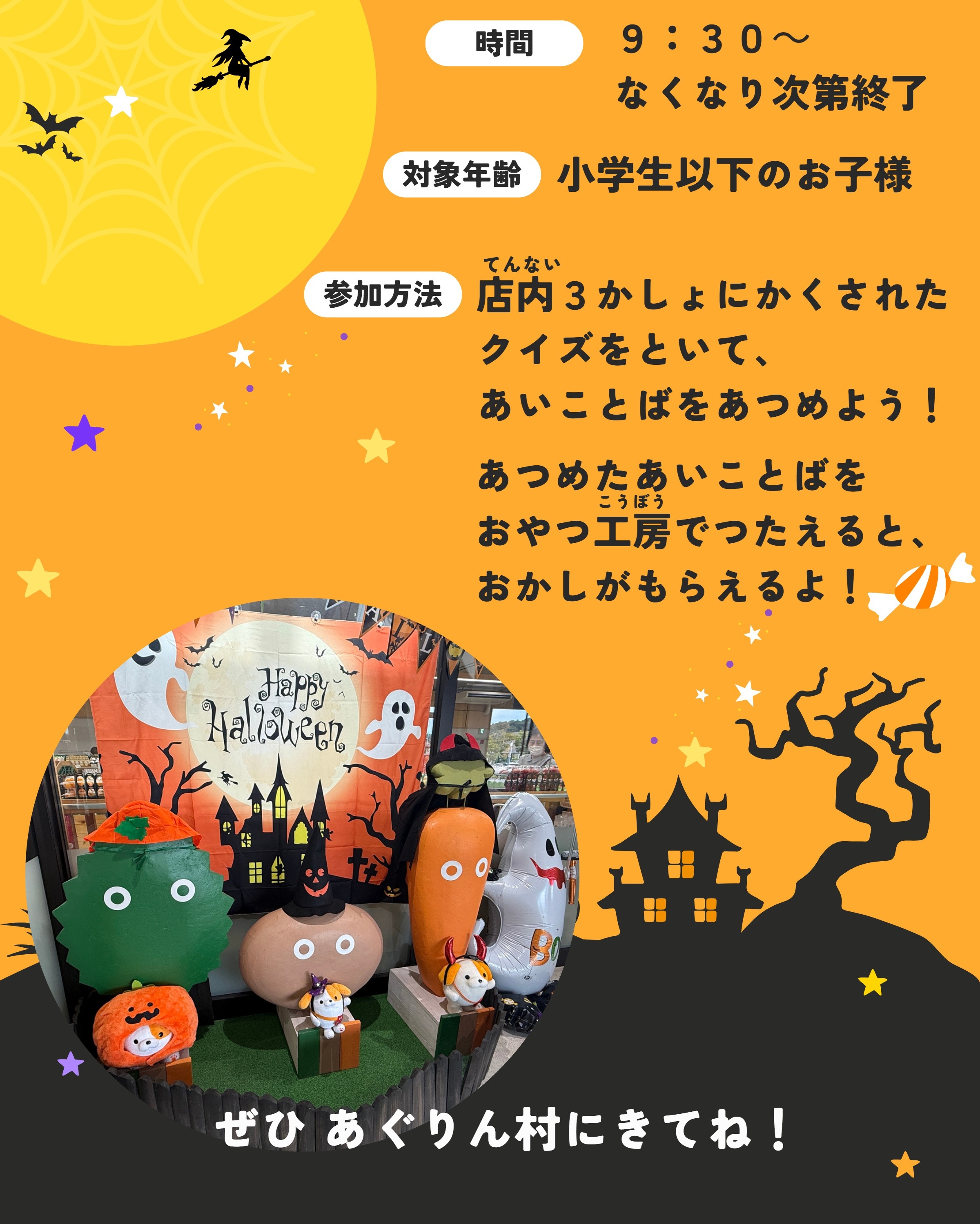ハロウィンなぞときクイズ ハロウィン限定イベントを開催! 隠されたクイズを解いて合言葉を伝えると お菓子がもらえるよ! 【開催日時】10月25日(土)・26日(日) 各日9:30~なくなり次第終了 【対象年齢】小学生以下のお子様(保護者のアシスト可) 【参加方法】店内3か所に隠されたクイズを解いて合言葉を集め、合言葉をおやつ工房で伝えるとお菓子がもらえます。